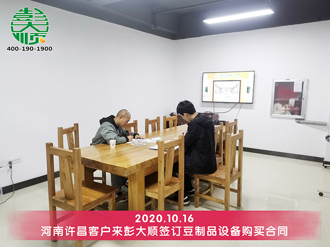 徐老板就擔心自己買了豆腐機設備但是做不出來好味道,到了彭大順現磨豆腐坊之后,現場品嘗了解后一切擔憂都解決了,于是愉快的與彭大順簽單達成合作,訂購小型豆腐機一套!