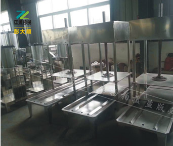 豆干機,是由磨漿脫渣系統(tǒng),煮漿系統(tǒng),壓榨(成型)系統(tǒng)組成的,豆干的制作前半部分,一般和豆腐制作相同,后面的壓榨(成型)系統(tǒng)壓力,則要比豆腐成型的壓力要大,豆干是用大豆作主要原料,摻以石膏、鹵水制成的豆制品,其制作工序為:磨漿、除渣、煮漿、定鹵、包塊、壓塊、上色。